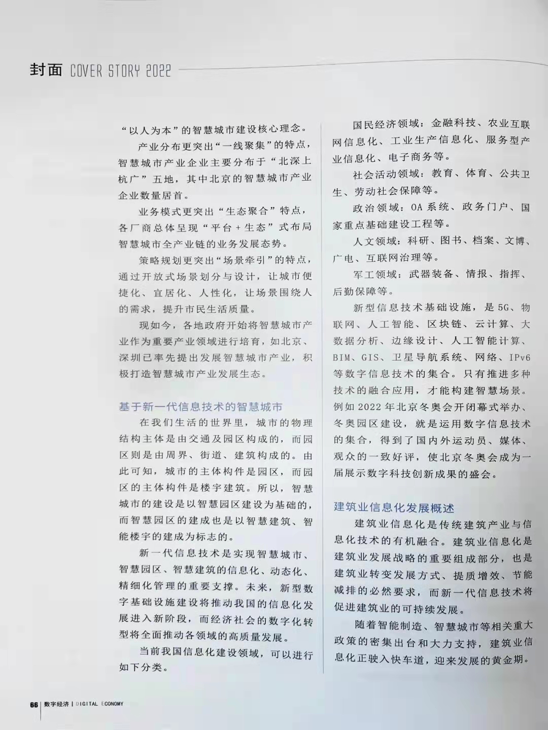 新型信息技术基础设施,是以5G、物联网、人工智能、区块链、云计算、大数据分析、边缘设计、人工智能计算、BIM、GIS、卫星导航系统、网络、IPv6等数字信息技术的集合,多种技术的融合应用,才能实现智慧的场景。例如2022年北京冬奥会开闭幕式、冬奥园区,就是数字信息技术的集合,得到了国内外运动员、媒体、观众的一致好评,把北京冬奥会变成一届数字科技创新的盛会。