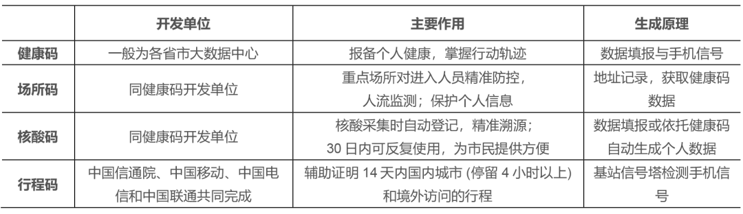 根据上面对各种二维码的介绍可以得出,健康码、行程码、场所码、核酸码的功能相互交叠又各有所长。它们之间的区别主要体现在下表中: