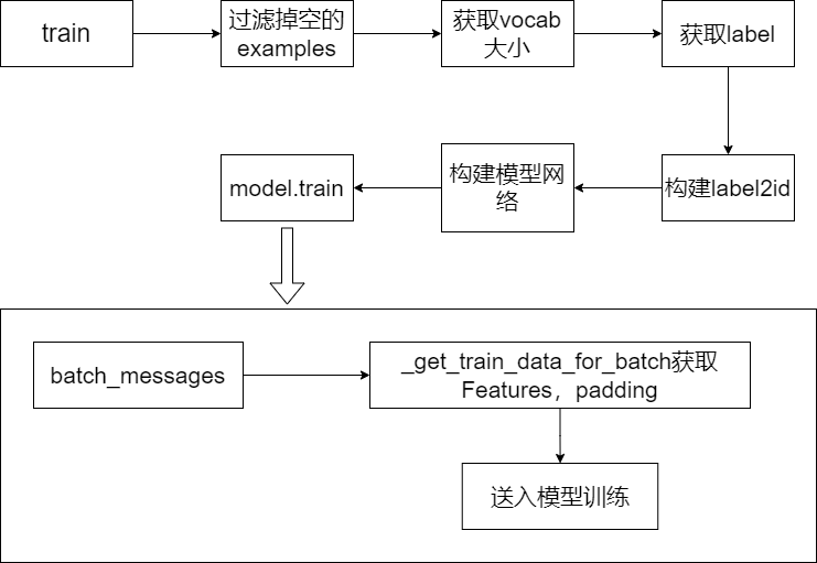 components的train函数 -> 过滤掉空的examples -> 获取字典大小 -> 获取label -> 构建label2id dict-> 构建模型网络 -> model.train