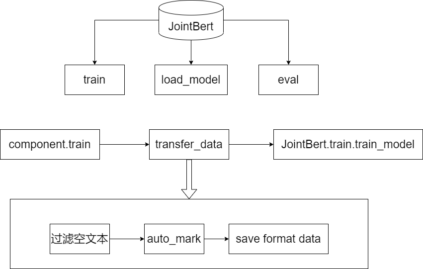 component的train函数 -> 通过transfer_data进行数据格式转换,将rasa的nlu数据转化为JointBert所需要的数据格式(具体为:过滤空文本, auto_mark进行实体标注,注意实体标注可能存在group和role的区分,save format data 保存为特定格式的文件)-> 调用JointBert的train.train_model进行训练。