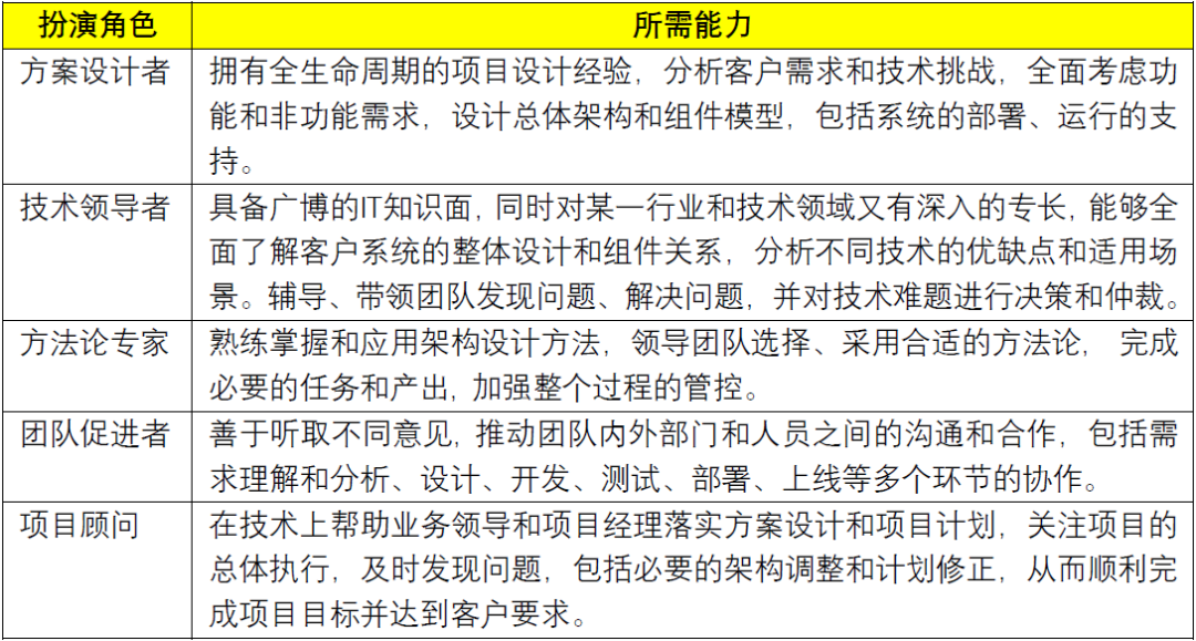 这期间,架构师扮演了方案设计者、技术领导者、方法论专家、团队促进者、项目顾问等多重不同的角色,如下表所示意: