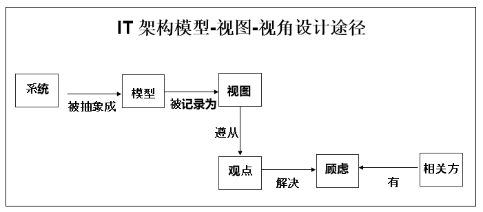 一个模型通过一个或多个视图来记录和表达, 一个视角从一组干系人的具体要求出发, 给出了解决干系人顾虑的要求和规格,一个视图遵从这个视角并将总体系统从不同关注点的角度进行表达, 模型、视图、视角的关系如下图所示: