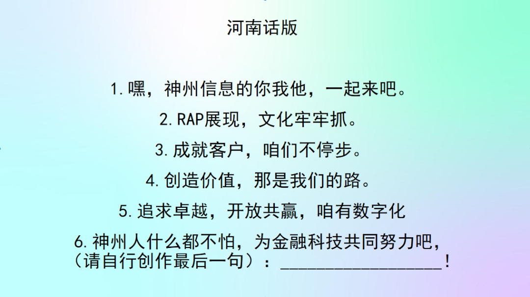 你对BB贝博艾弗森官网的新文化价值观熟悉吗?来来来,欢迎来参加神州Rapper挑战赛!让我们用最嗨皮的方式说出我们对BB贝博艾弗森官网新文化的理解。速度为王,又快又好!